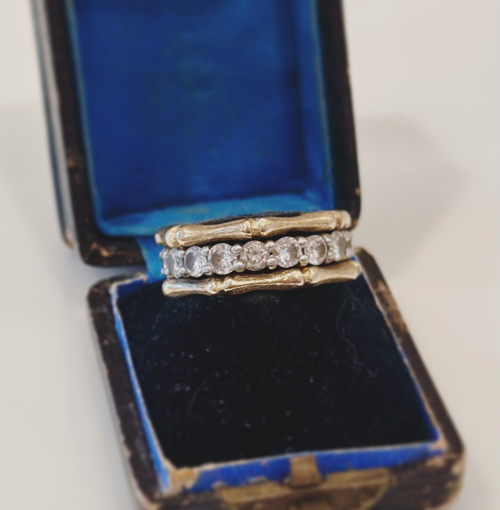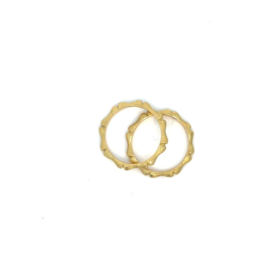 Handmade in 18 karat yellow gold. The perfect layering ring in a bamboo motif with a Florentine finish. This ring looks chic alone or flanking any eternity band.